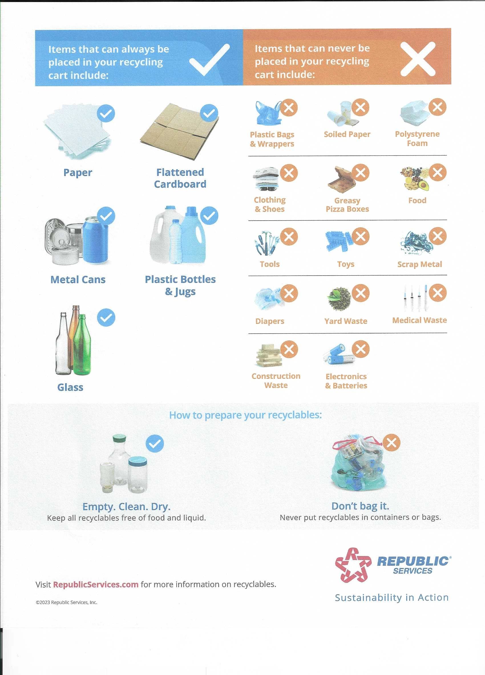More than 7.5 cubic yards of household junk and debris; regular household trash, food, small items that could be put in household trash carts, human waste, yard waste, dead animals, tires, large auto parts, rocks, sand, glass, concrete, remodeling/renovation materials, infested items posing a risk to workers (see paragraph below), nor any materials placed in opaque/non-transparent plastic bags. Due to potential health risks, items placed in opaque/non-transparent plastic bags will not be accepted. Smaller bulk items must be placed in open boxes or clear plastic bags.