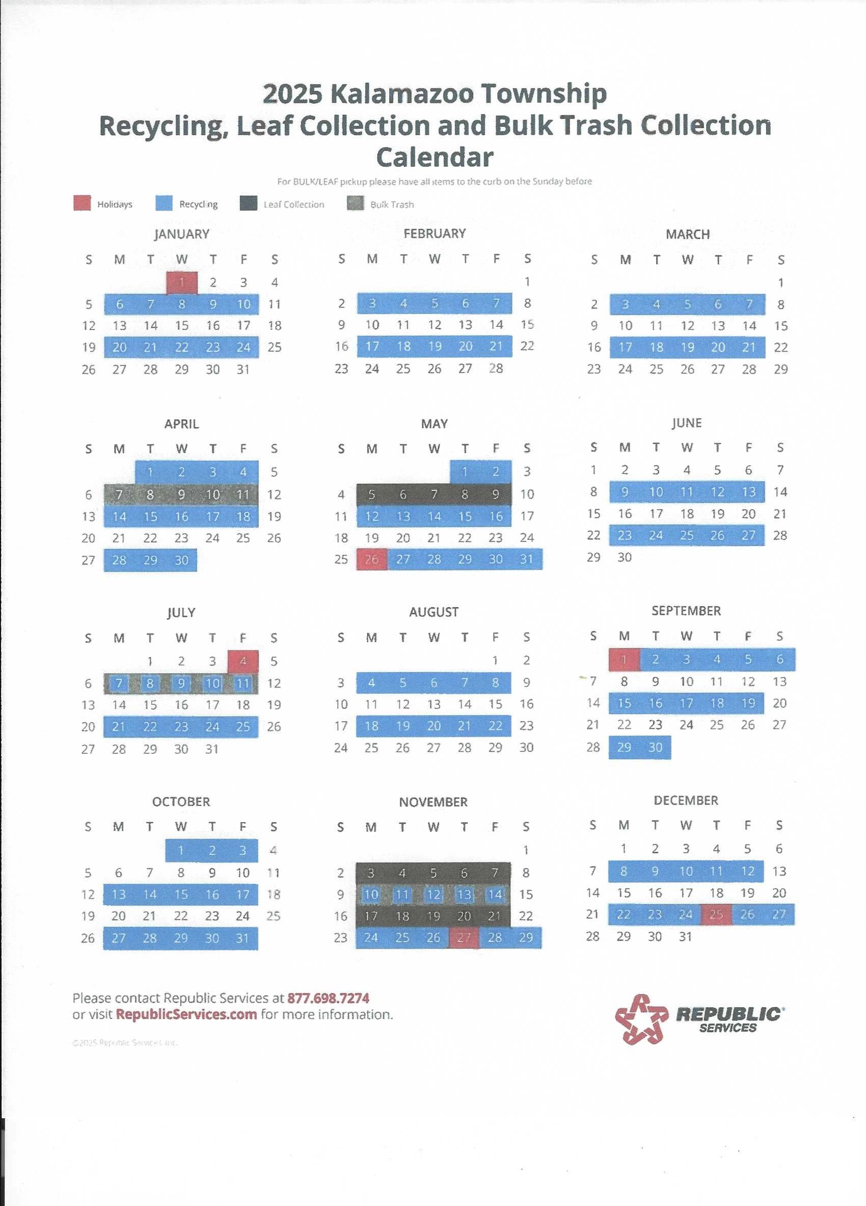 Please note that leaves are not accepted as part of the monthly brush program. Leaf pickup is offered every fall between October and December, and leaves are also accepted as part of the special April Spring Clean Up. For questions about the brush collection program or to report a missed pick up, please call (269) 337-8215. You can also report missed pick ups and receive notices regarding this and other services by downloading the Recycle Coach app on your mobile device.